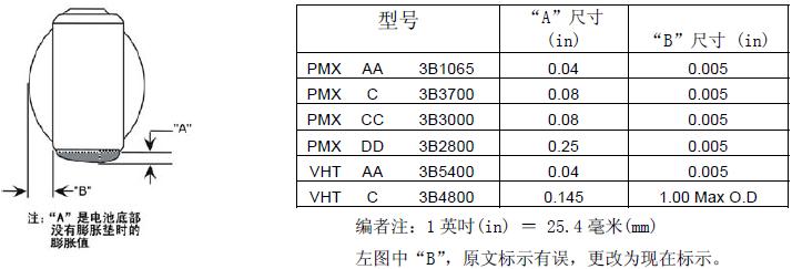 在正常情況下,PMX 和VHT系列的電池,在高溫下釋放電流時,其底部會膨脹。廠方會提供電池底部的膨脹墊,以保證其正常供電。如果丟失或拆除這一墊片,在設(shè)計電池盛載盒時,必須按電池的設(shè)計圖紙預(yù)留與膨脹相適應(yīng)的間距。